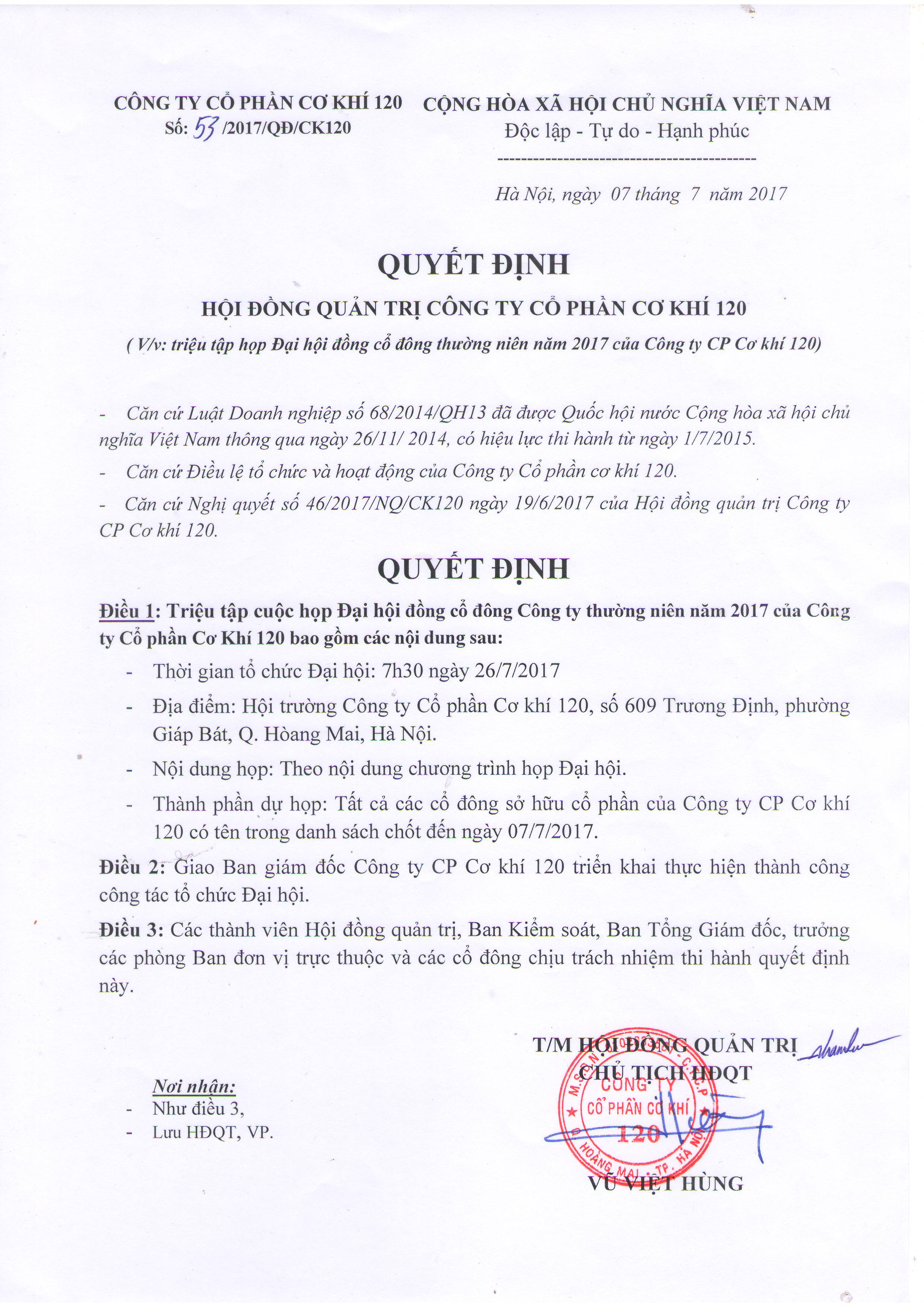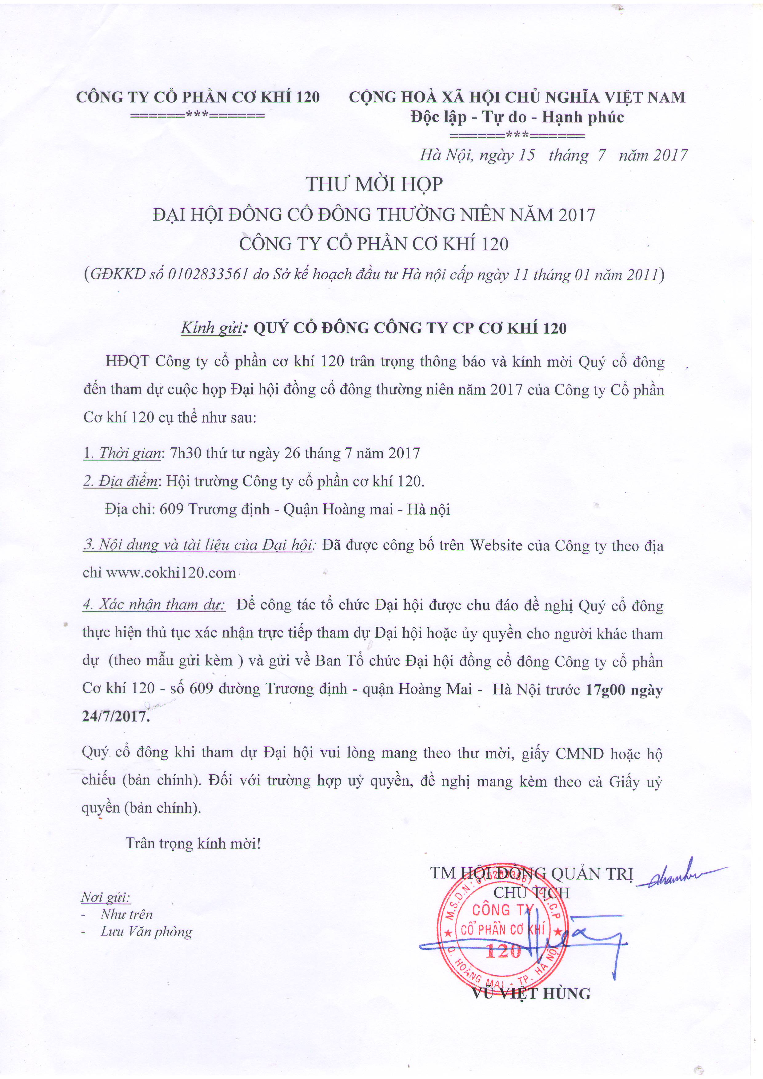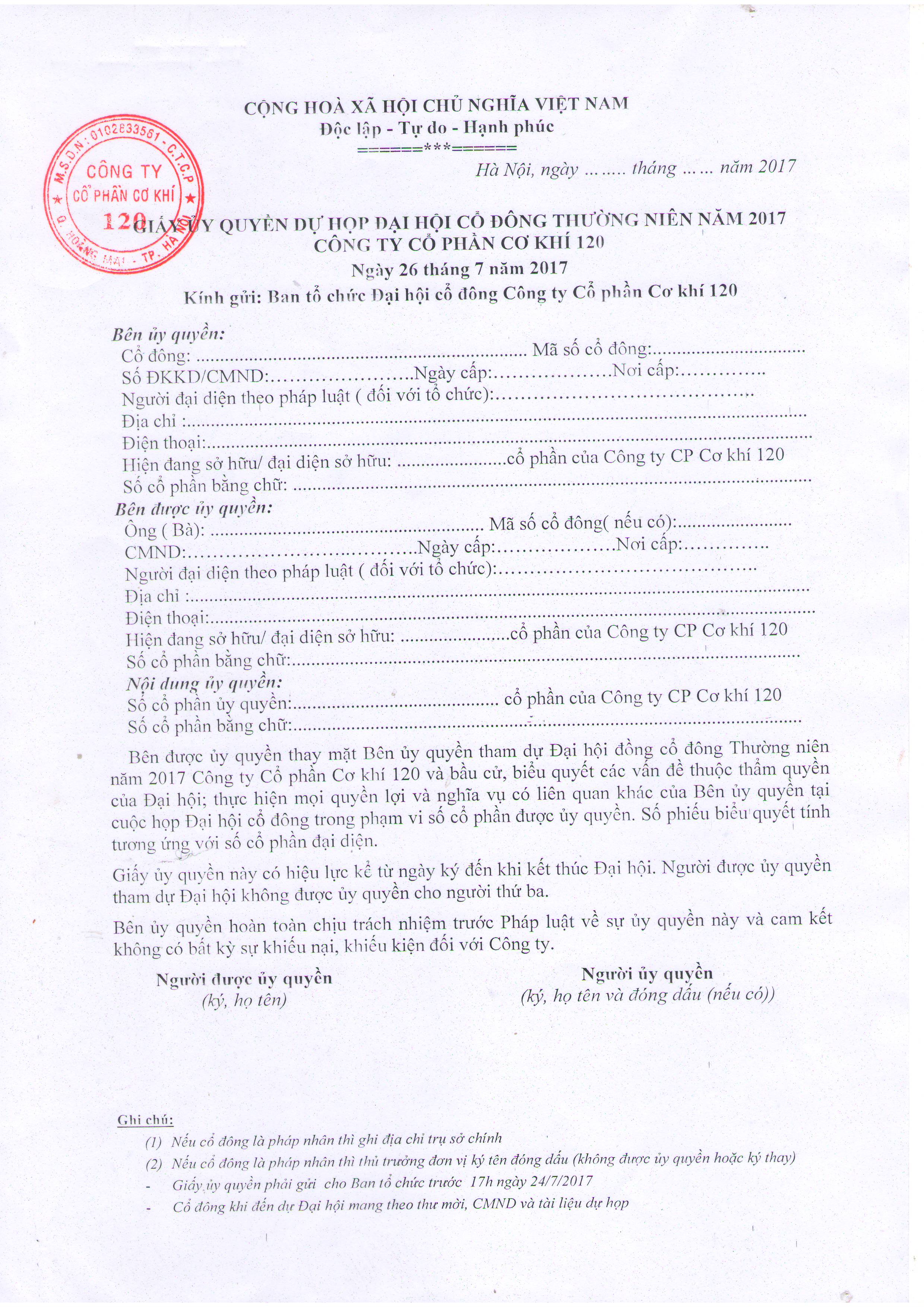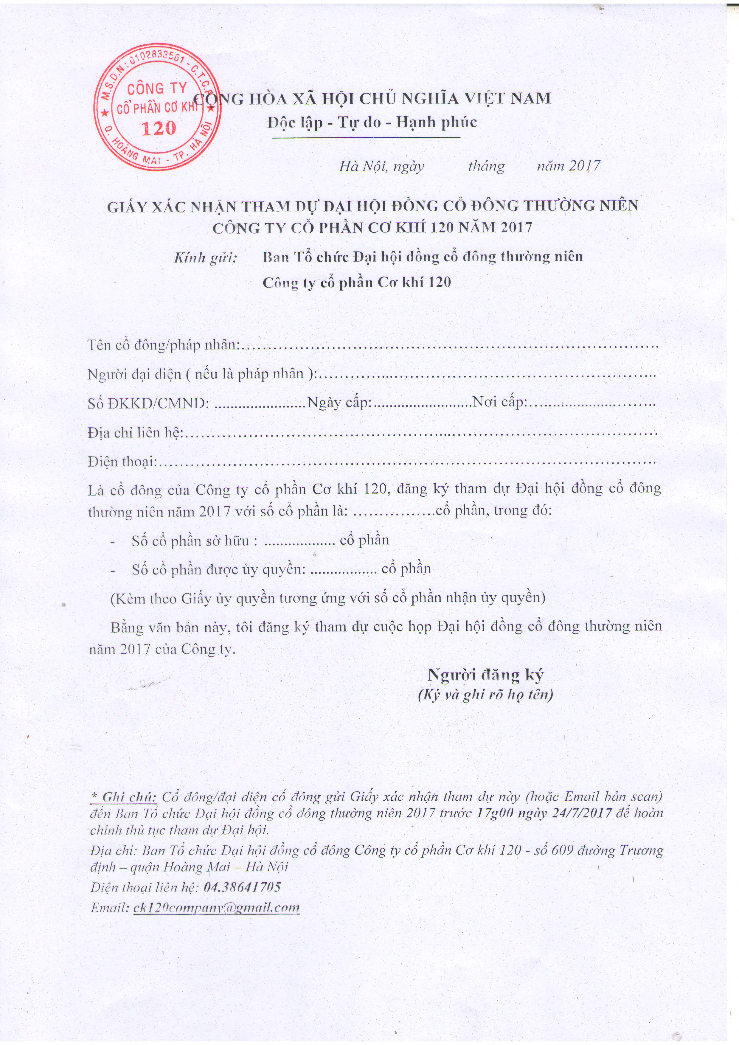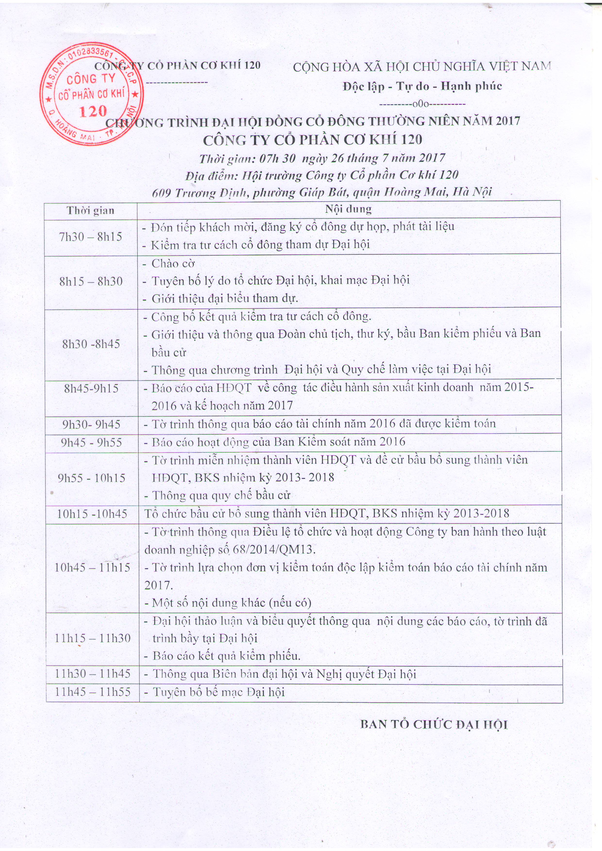 Thông báo ĐHCĐ thường niên năm 2017 của Công ty CP cơ khí 120