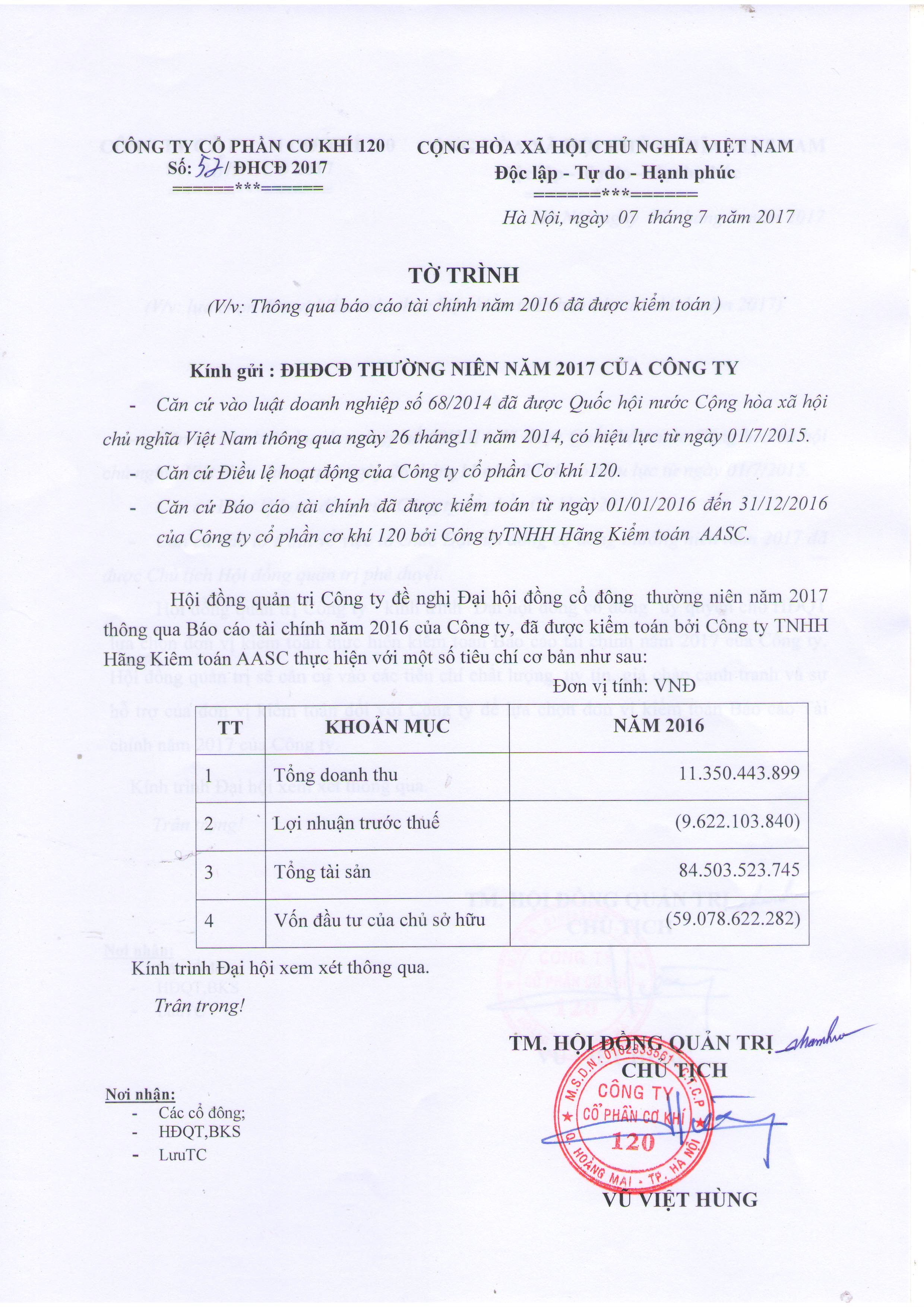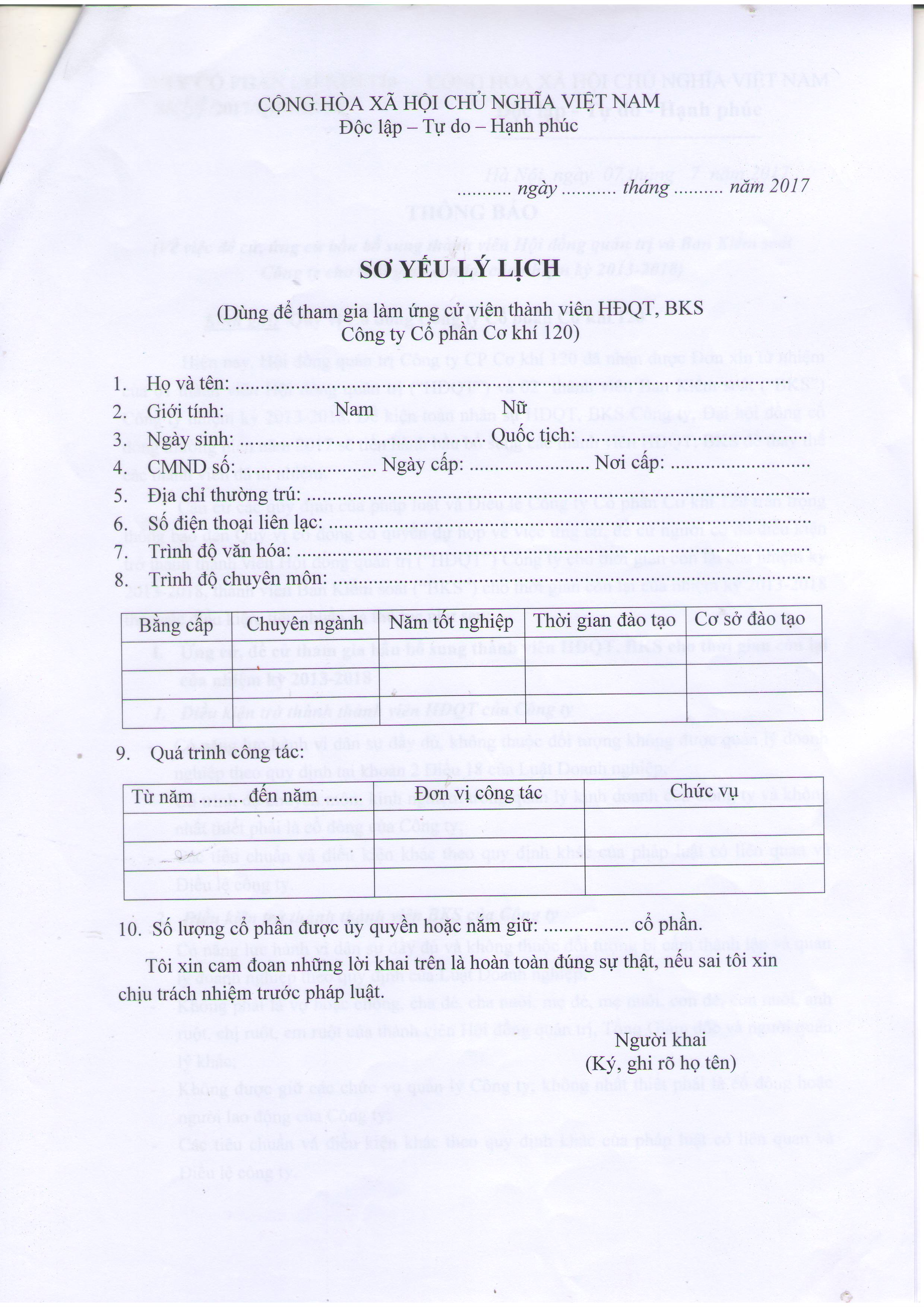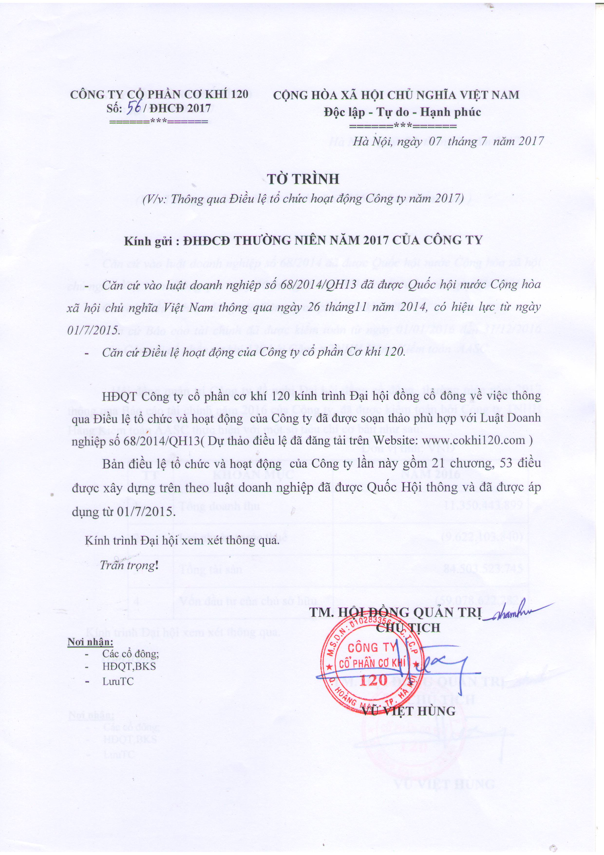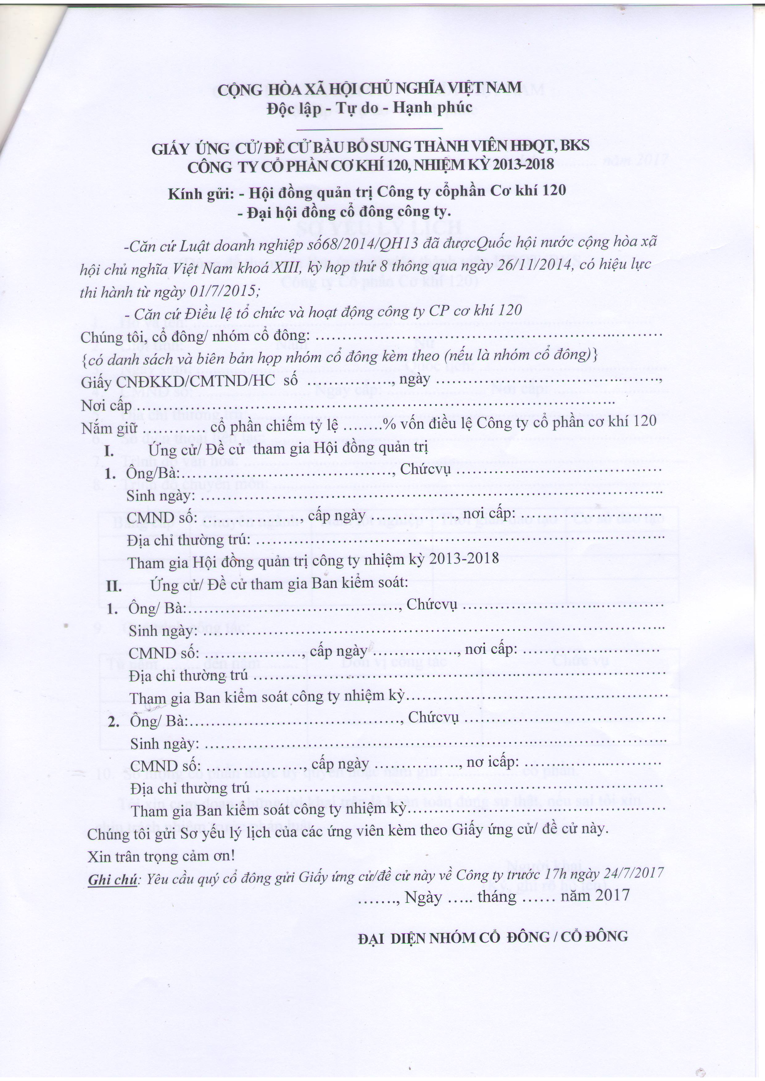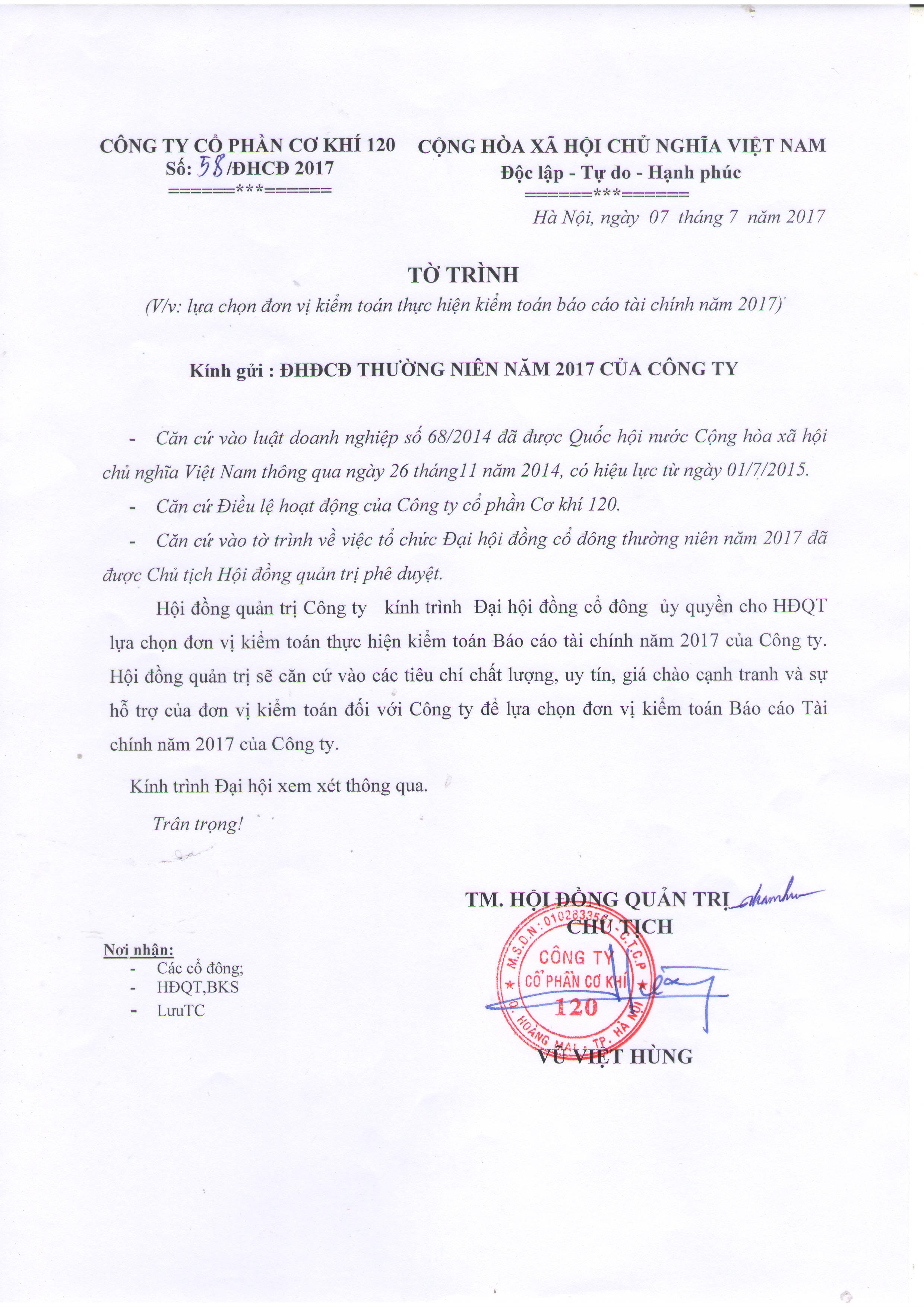 Thông báo ĐHCĐ thường niên năm 2017 của Công ty CP cơ khí 120
